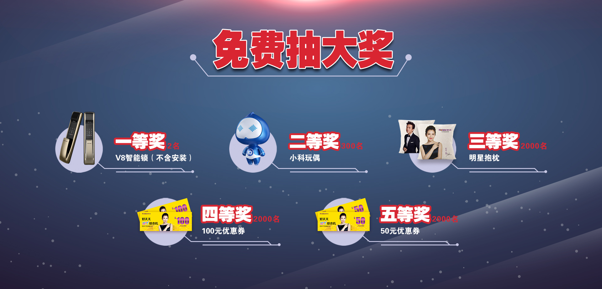 每日可免費抽獎一次,價值2998元的科徠尼高鐵專列版V8、明星抱枕、小科玩偶、100元/50元優(yōu)惠券天天送。