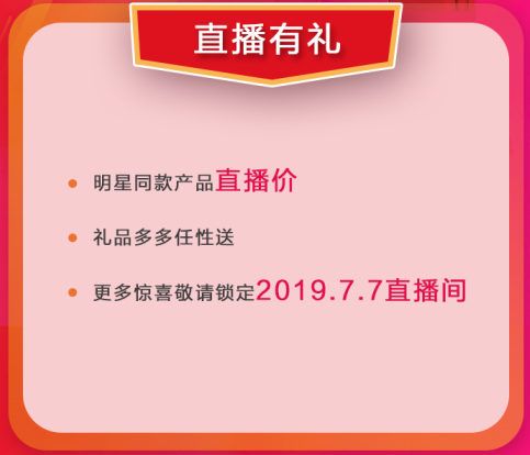 通過(guò)線上直播系統(tǒng),客戶可自由選擇在線上微商城或線下門(mén)店下單,均可享受直播價(jià),禮品多多狂歡送。更多驚喜敬請(qǐng)鎖定2019年7月7日直播間